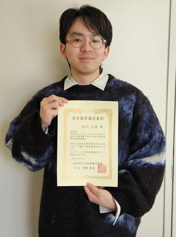 大阪公立大学中百舌鳥キャンパスにて開催された日本流体力学会年会2025にて,石川大貴 (M1) が若手優秀講演表彰を受賞しました.